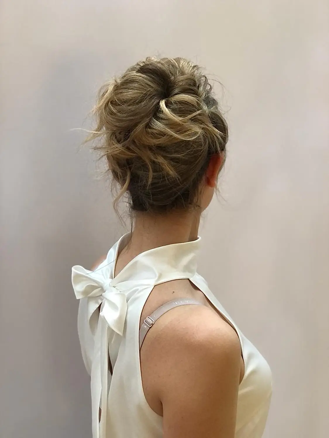 die Hochzeitsfrisur wirkt mit hellerem oder gesträhntem Haar interessant und lebhaft. Man kann Höhen und Tiefen besser erkennen, die Brautfrisur bekommt Lockerheit und Luftigkeit.